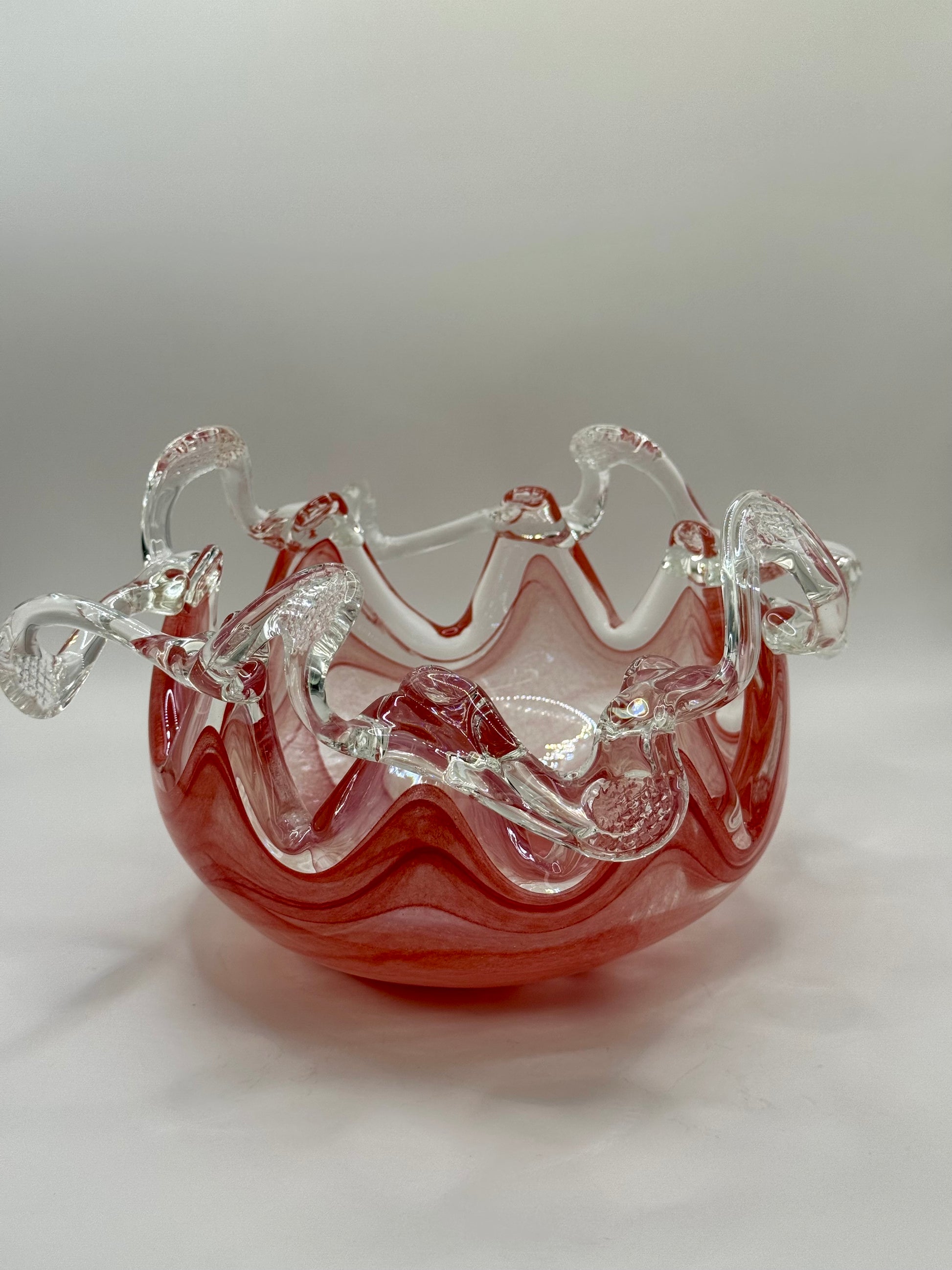 This ornate, hand-blown art glass bowl features a swirling cranberry-pink base and dramatically crimped clear rim — a style strongly reminiscent of Murano glass artistry from Venice, Italy. The pulled glass "crown" detail on the rim, with applied clear loops, reflects traditional Murano techniques used in the mid-20th century. If not Murano, it may be a 1960s–80s Bohemian (Czech) interpretation during the era when European artisans competed in decorative glassware.