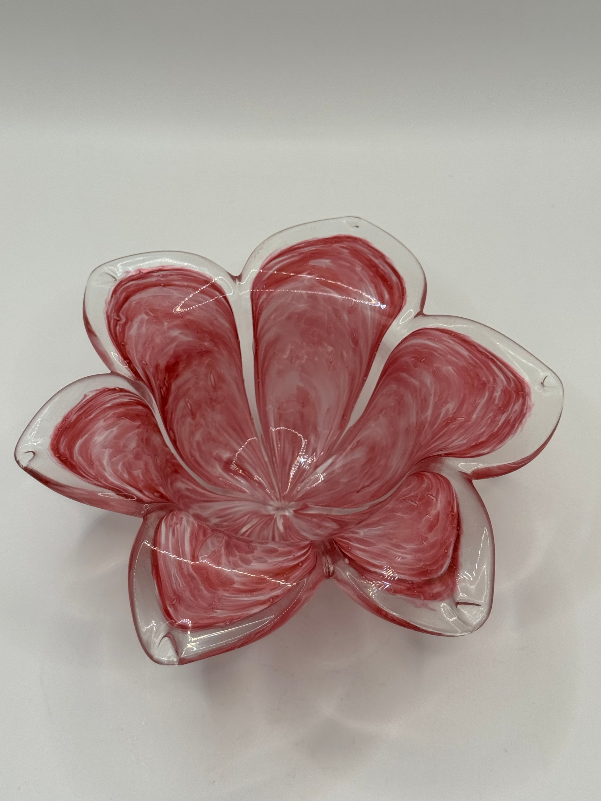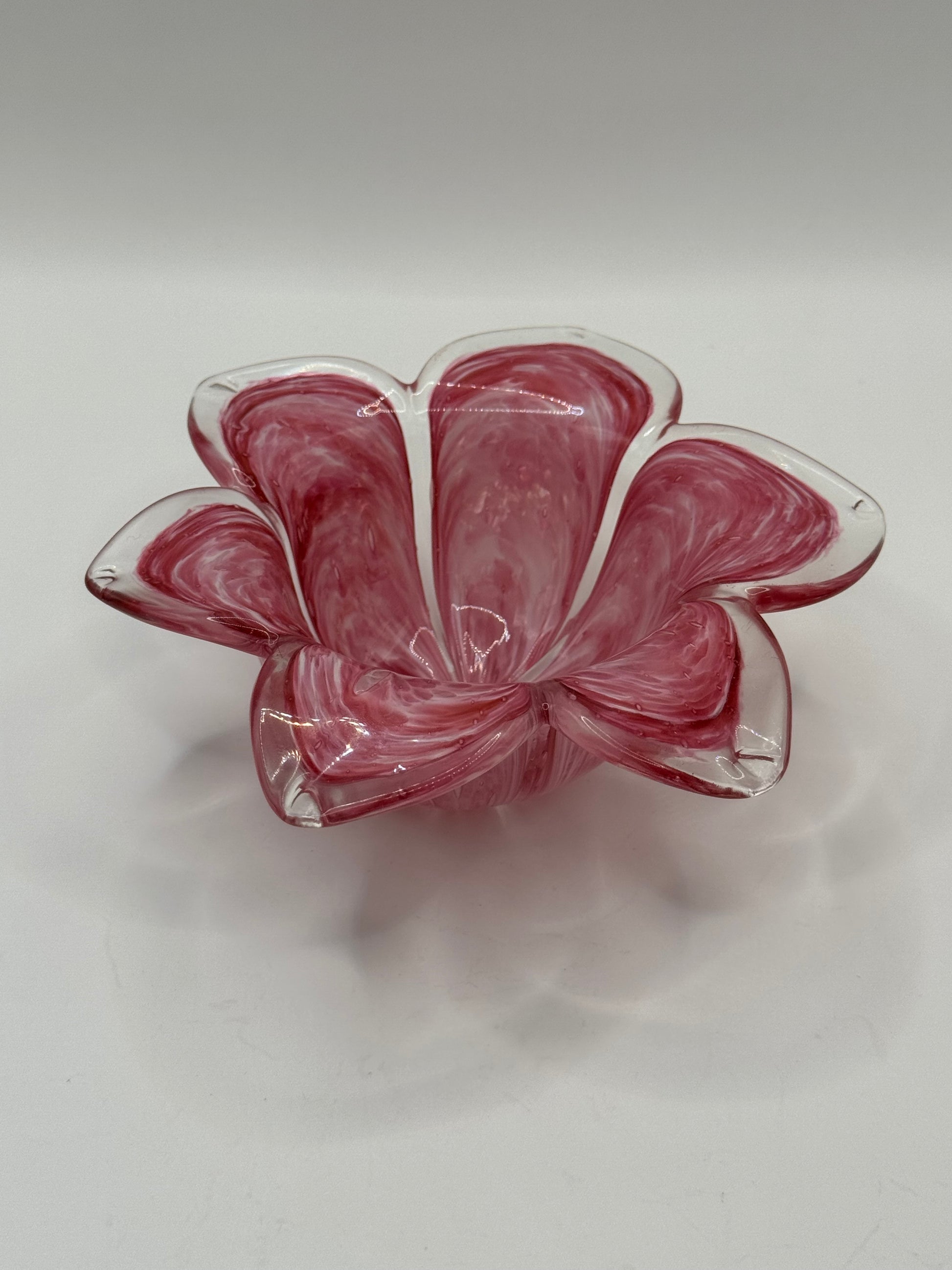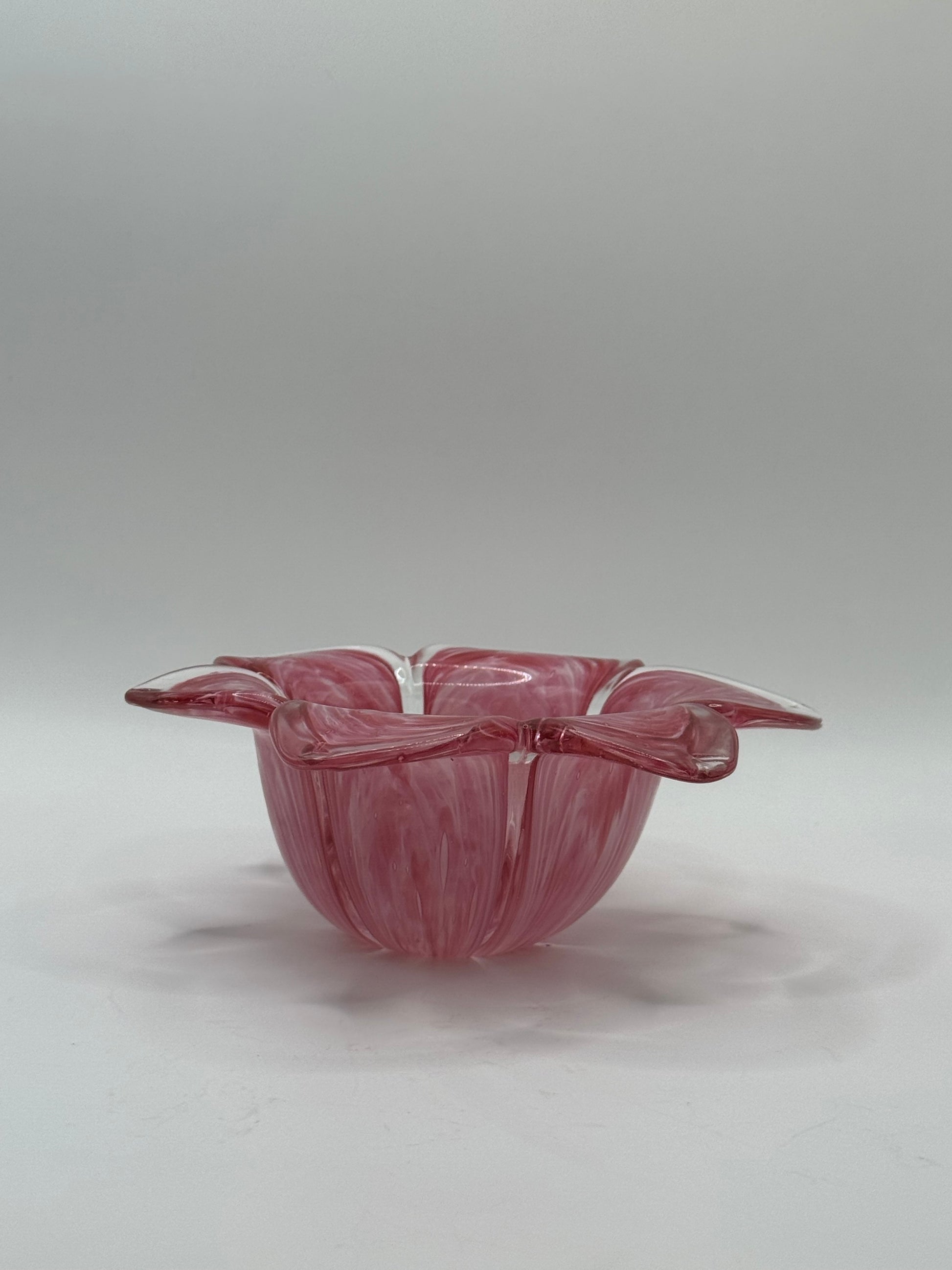 Inspired by the elegance of a blooming flower, Petal Whisper is a hand-blown art glass bowl in delicate swirls of rosy pink and soft white. With gently flared petal tips and a sculptural, rippled form, this piece captures light and movement beautifully.
